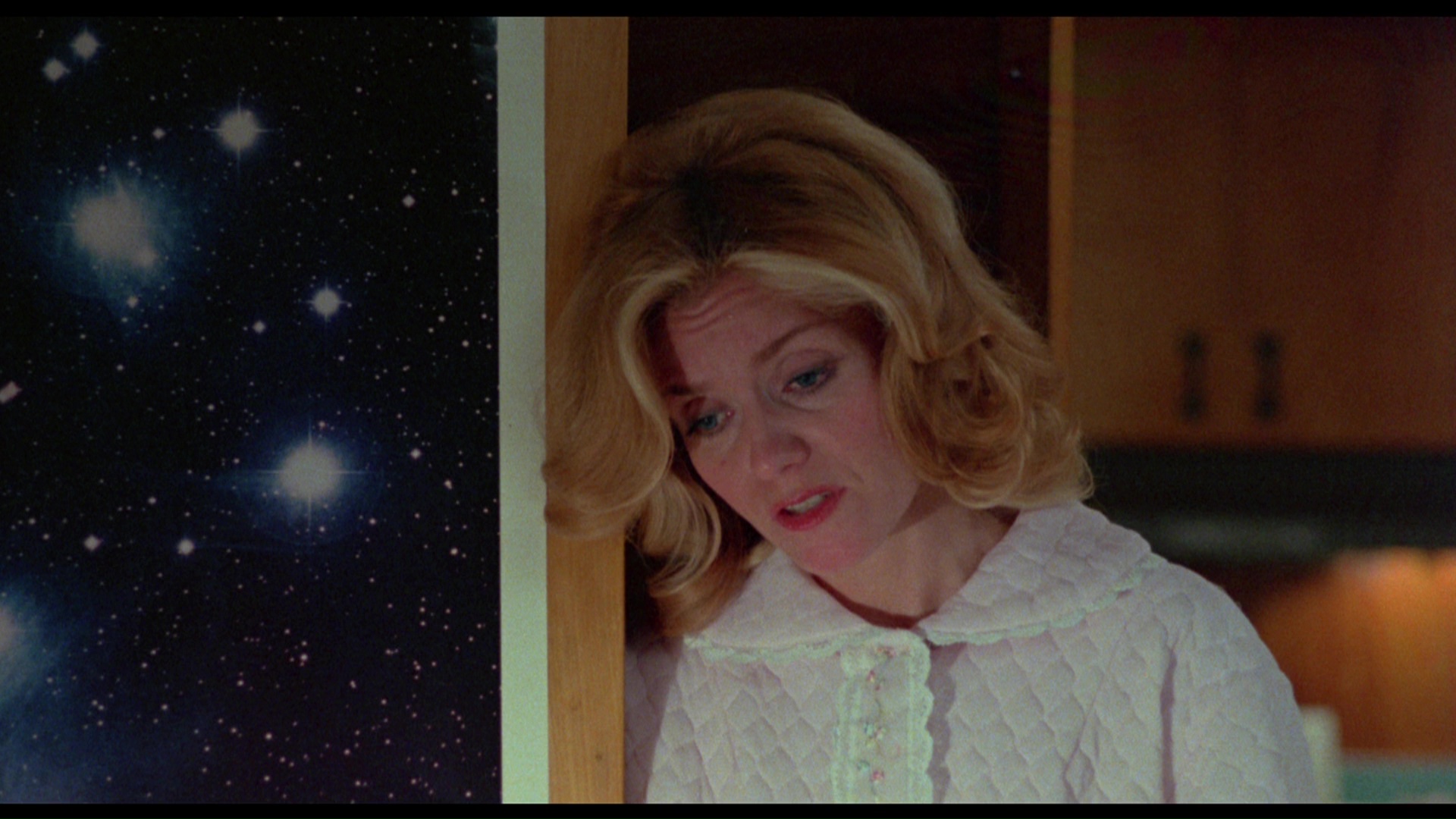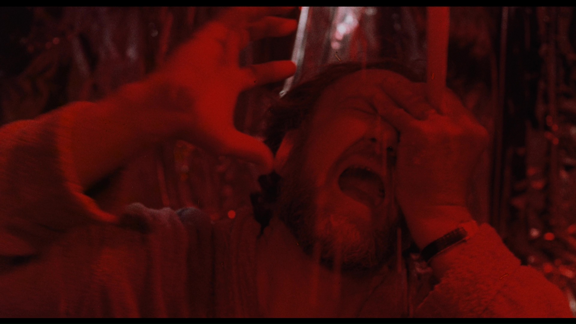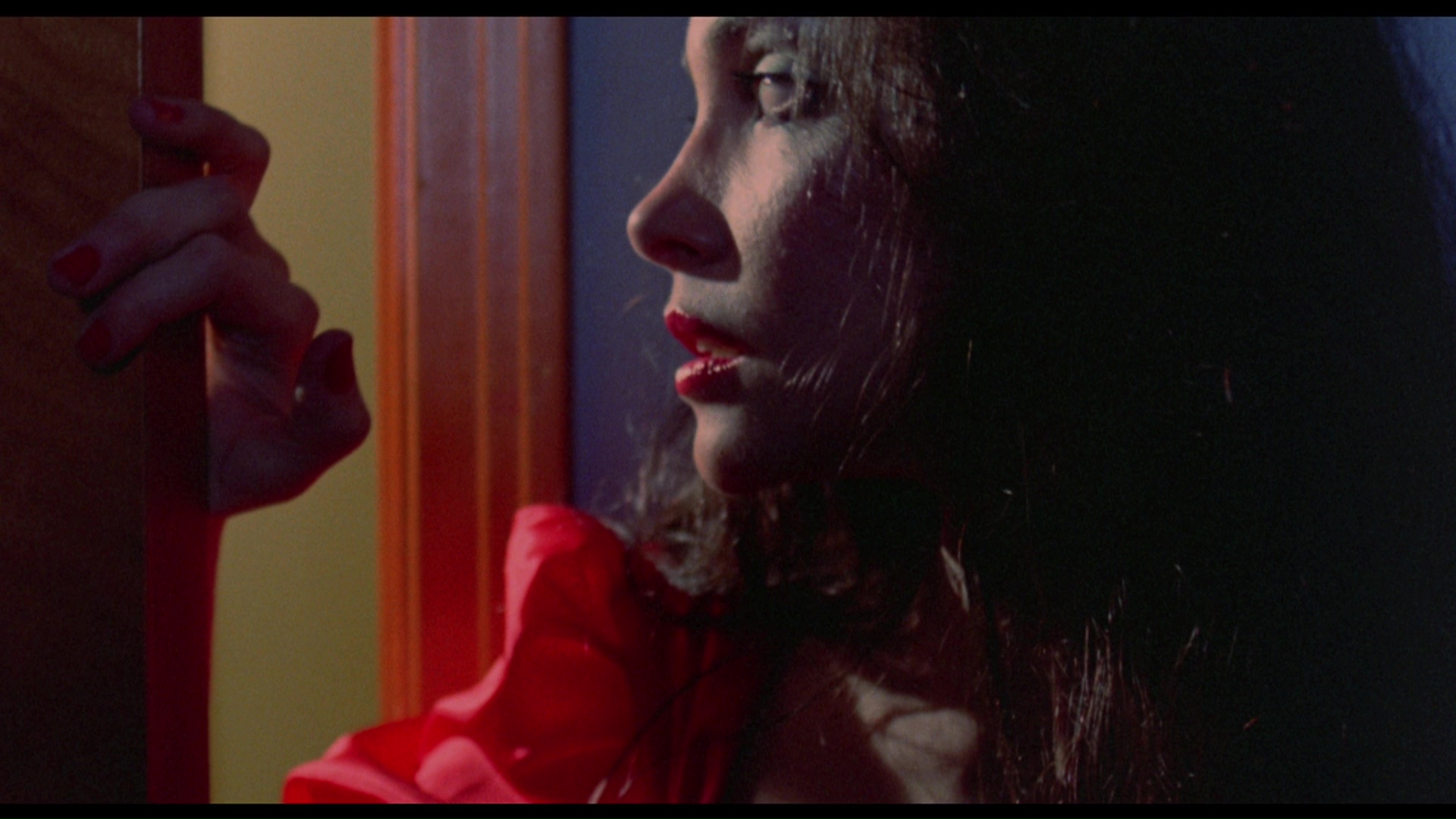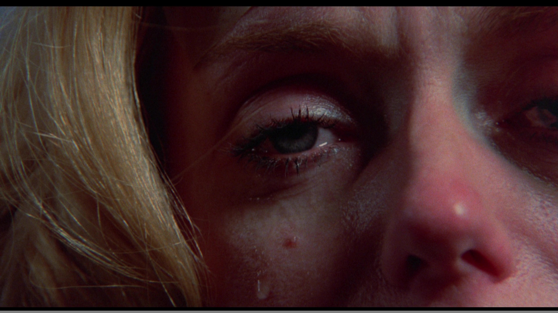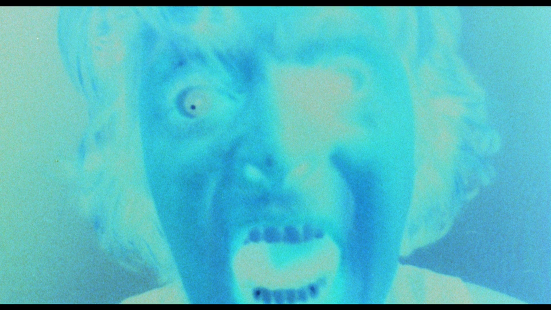 widely available film out of the bunch on home video, The Premonition hit VHS from Embassy in the '80s and made the leap to DVD in 2005 from Media Blasters under its Guilty Pleasures banner. The widescreen transfer was essentially fine for the time (more on that in a moment) with English and Spanish mono tracks plus a reworked 5.1 mix. Extras included a direor's commentary, a photo gallery, the theatrical trailer, over three minutes of TV spots, a 16-minute interview with the late Lynch, a 6-minute interview with Schnitzer, and a batch of bonus trailers (Blood Sisters, Banned, The Oracle, Just Before Dawn). The Arrow release carries over the commentary, trailer, TV spots, and two interviews, while ditching the 5.1 remix in favor of a more faithful LPCM mono version. What's fascinating is how radically different the transfer is, with significantly more image info on the sides (how much seems to vary from reel to reel as this was shot open matte and composed at the telecine operator's whims) with very different, more centered framing in many scenes. The color timing is also different with more natural flesh tones compared to the blown out ones in many scenes on the DVD, and the flashes of Sheri's visions now have stronger tinted hues (like the light blue one in the frame grab on the left) compared to the nearly desaturated ones seen on the DVD. All in all it's a much more satisfying and impressive viewing experience.