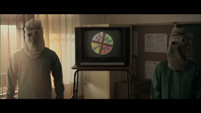 The opening is actually a fairly potent curtain raiser as a man with a big, bloody "X" branded into his face wakes up in a sunny classroom filled with students only to see a sinister red box (marked "X Box," though probably not related to Microsoft in any way) . We soon realize that all the "students" seated in desks around him are faceless mannequins, and after reaching in the box to pull out something determining his fate, he winds up splattered into a bloody mess outside on the pavement. Apparently this is the latest in a string of mysterious, hushed-up disappearances and freakish deaths in the area, though the students are more concerned about their love lives and hanging around squabbling with each other. Among these are Hideaki, who gets pelted with a sinister piece of paper marked "Death Penalty" but tosses it aside to chase after his irate girlfriend, Rikako, who thinks he's playing around on the side. As it turns out that dead guy was a former childhood classmate of Hideaki and pals, who were quite the bullies in their formative years. A creepy computer torture video and other uncanny events soon tip them all off that something's amiss, and soon the couple and two of their old friends find themselves trapped in that same classroom, a recreation of the one from their childhood. Two creepy psychos in green surgical smocks with bags over their heads enter the room and, armed with taser rods, force the quartet to participate in an increasingly sadistic string of "games" determined by the box. A "school lunch" (consisting of rice and maggots), forced milk chugging, a "pencil guillotine" ca