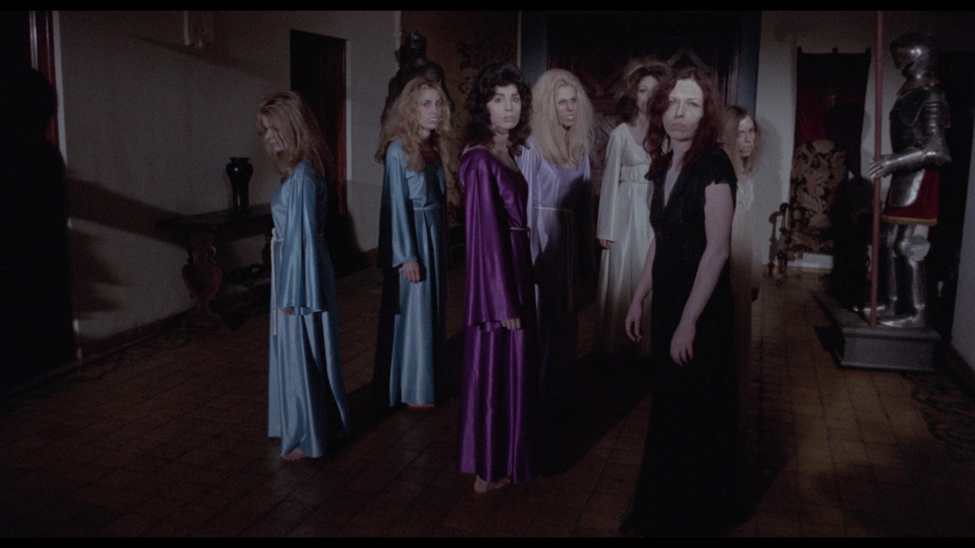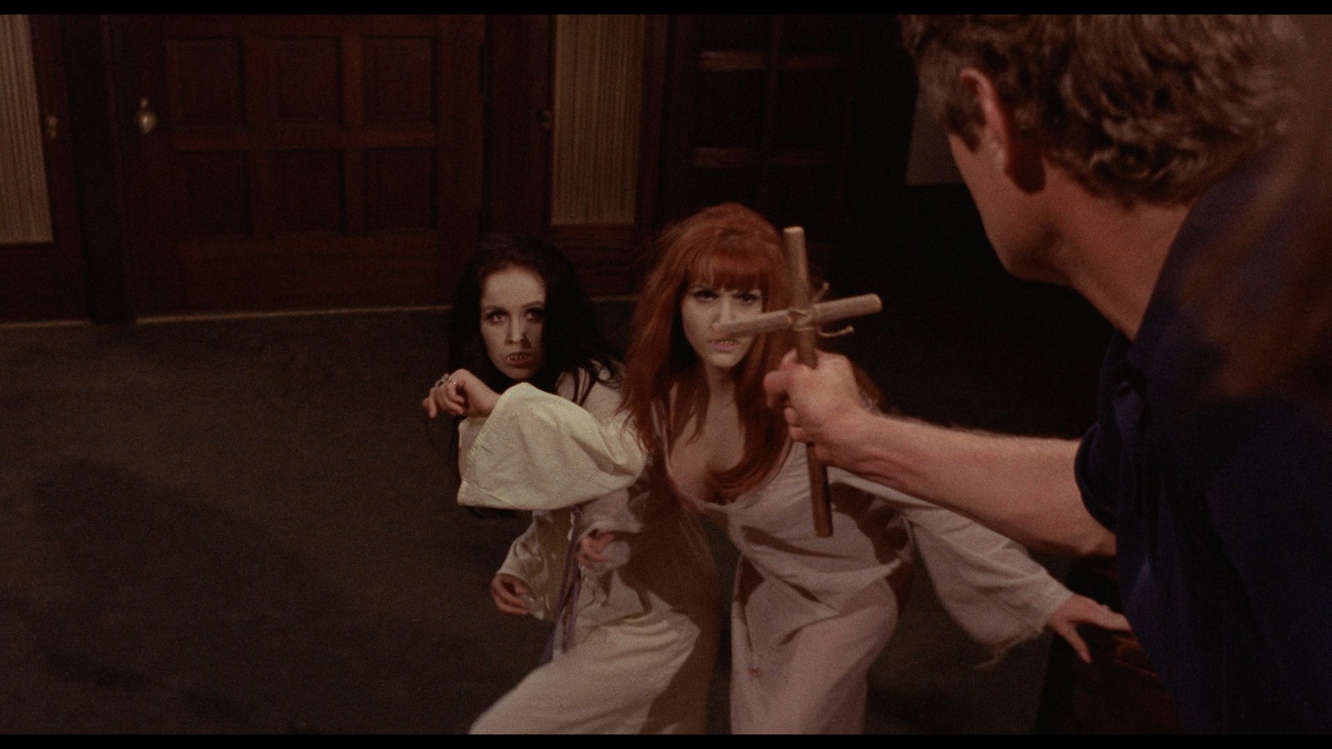 At a costume party on the premises, Yorga strikes up a rapport to Cynthia and irritates her fiance, David (Perry in an entirely different role), but that's just a prelude for a savage attack that night by Yorga's vampire brides. The next morning Cynthia has no conscious recollection of the assault, but in Yorga's clutches she has sudden nightmarish flashes and tries to piece together everything that really happened as the vampire turns out to be completely smitten and hellbent on making her his next bride.