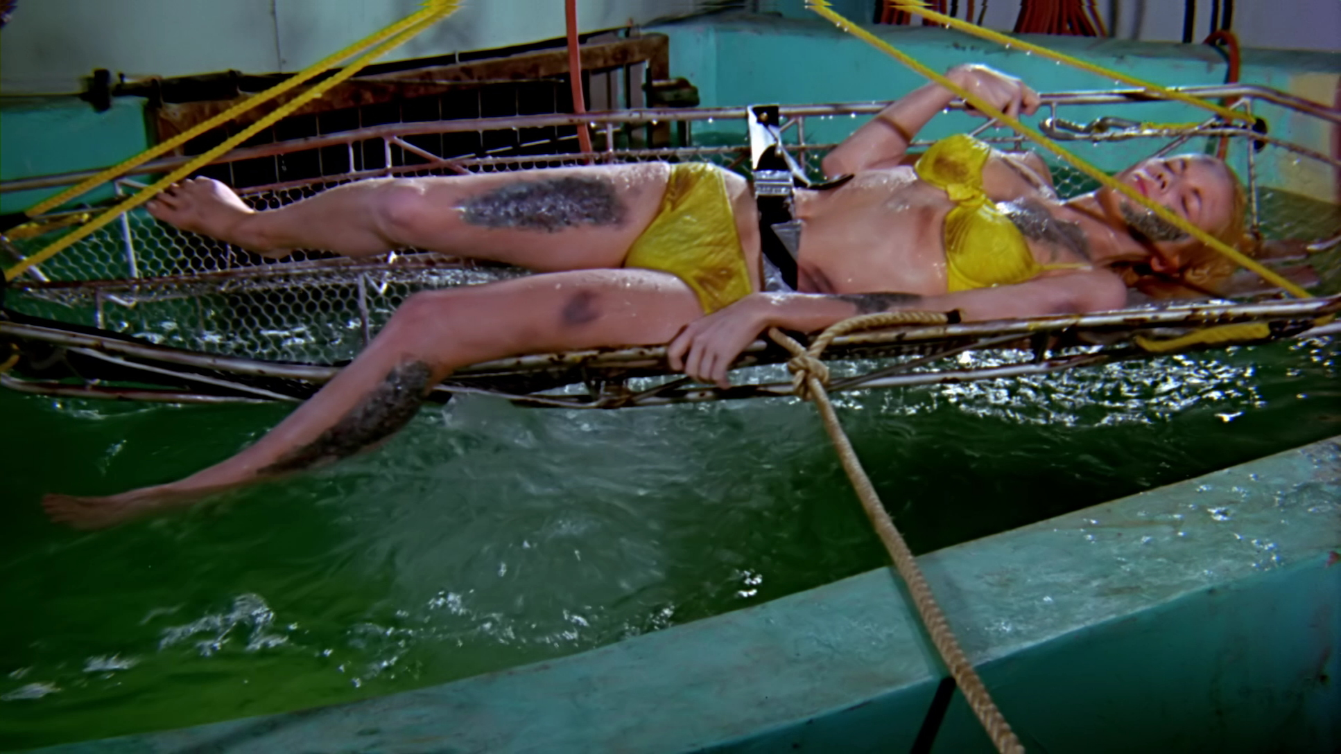 Film Chest has established itself as an interesting, enthusiastic company over the past year releasing dual-disc Blu-Ray and DVD editions of some pretty wild cult titles you’d never expect to get the HD treatment including Poor Pretty Eddie, Carnival Magic, Dementia 13, and The Terror. By now collectors have a pretty idea of what to expect from one of their releases: lots of crazy extras, eye-popping colors, and loads and loads of noise reduction till any natural film grain and fine detail like pores, fabric textures, and individual hairs is obliterated from the screen except in tight close ups. It’s still light years ahead of the TV and video versions floating around, of course, but don’t expect anything even close to razor sharpness here. The scrubbing isn’t as severe as Dementia 13, but it would be nice if they’d still dial it back a few notches so you can actually see the hairs on the actors’ heads. As mentioned before, the color here is pretty stunning across the entire spectrum; there’s something about that film stock in low-budget American horror films until the early ‘70s that creates a garish, almost hypnotic palette unlike anything else in cinema, for better or worse. The standard lossy Dolby Digital mono track is included here with optional Spanish subtitles (“Escorpion poderoso. Bestia peligrosa del oceano!”).